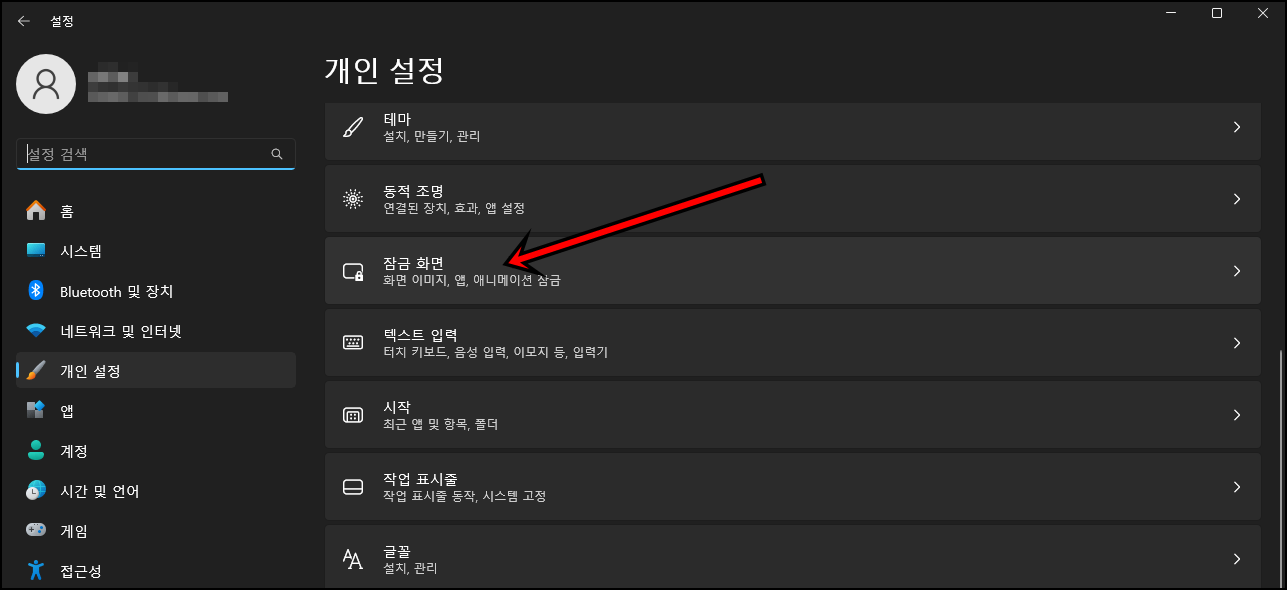 개인설정 화면에서 "잠금 화면"메뉴를 클릭해 주세요.