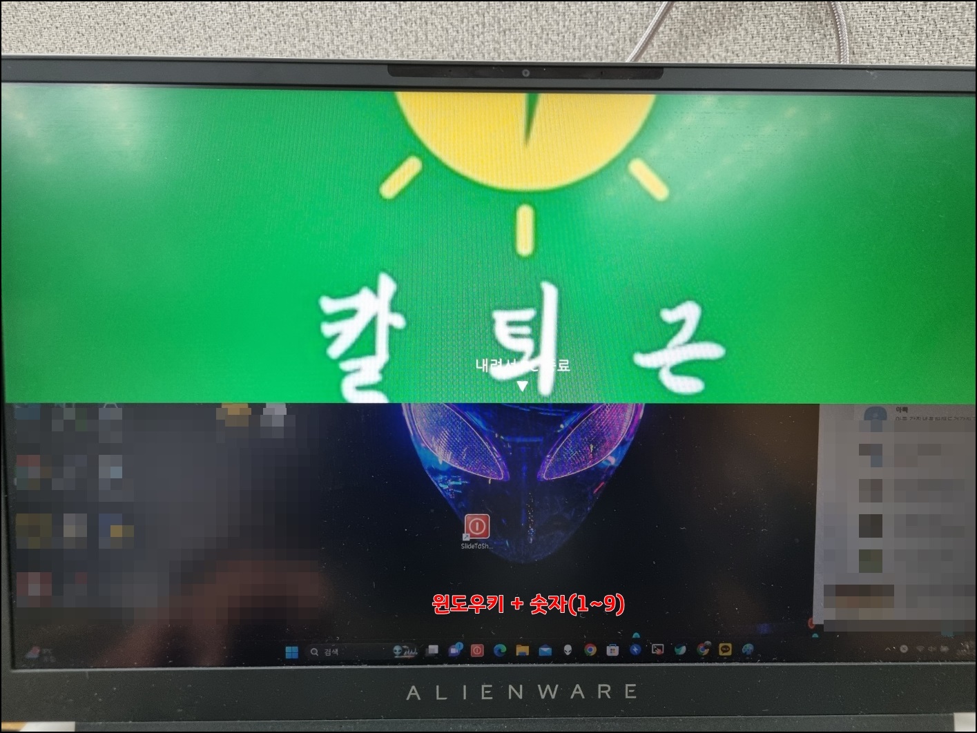 이제 윈도키+숫자 1 (1은 작업표시줄 순번)을 클릭하여 위와 같이 화면이 나오는데 화면을 내리게 되면 PC가 종료하게 돼요. 사실 기본으로 끄는 방법과 해당 방법으로 종료하는 방법에 시간차는 크게 나진 않지만 남들과는 다르게 PC를 종료하니까 좀 색다른 것 같기도 해요^^.