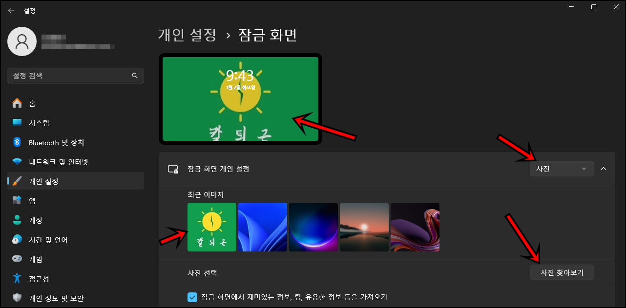 잠금화면 이미지를 "사진 찾아보기"를 클릭하여 여러분이 적용하고 싶은 사진을 적용해 주시고 창을 닫아주세요.