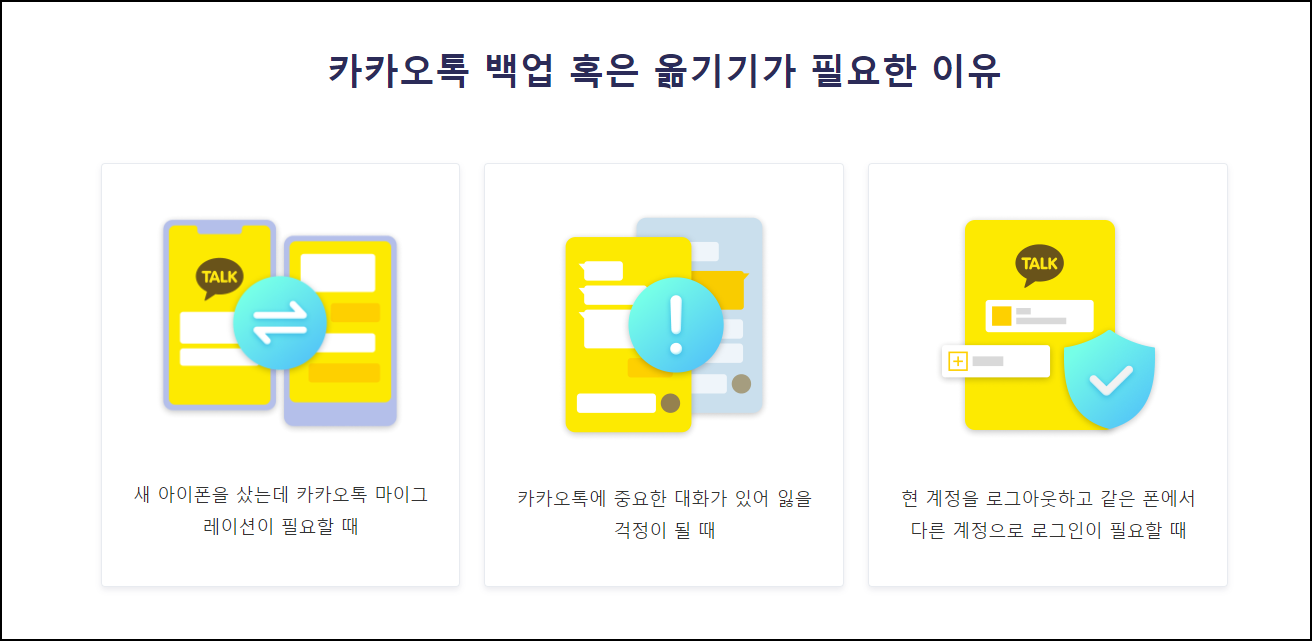 "iCareFone for Kakao Talk 아이케어폰 카카오톡" 을 다양한 상황에서 활용할 수 있는데요. 카카오톡에 중요한 대화, 파일 등 잃을 걱정이 될 때 혹은 시간제한 없이 14일 이전의 백업파일을 복원하고 싶을 때 등 여러 가지 상황에 따라 사용해 보시면 좋은데, 특이 아이폰 유저의 경우 기기 변경 시 마이그레이션으로 데이터를 전송하게 되는데 카톡의 경우 별도의 백업을 하지 않으면 데이터가 전송되지 않아요. 이과정에 기존 대화내용이 유실되거나 지워질 수 있는데, 이럴 때 "iCareFone for Kakao Talk 아이케어폰 카카오톡" 을 사용해 보시면 좋을 것 같아요.