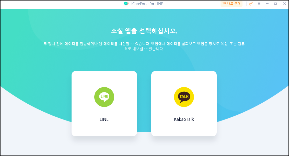 프로그램을 실행하면 위와 같은 화면을 만나실 수 있는데, 라인앱도 지원하고 있어요. 오늘은 카톡에 대해 설명드리고 있기에 오른쪽 "카카오톡"을 선택해 주세요.