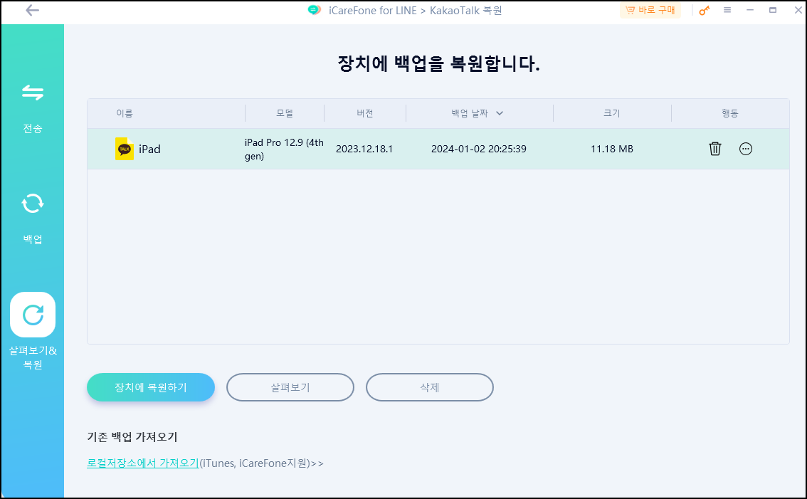 PC와 아이폰&아이패드가 연결되면 백업 장치 선택 부분에 연결된 기기가 확인이 되는데 해당 기기에 카카오톡 백업을 진행하고 싶으시다면 "바로 백업"을 클릭해 주세요.