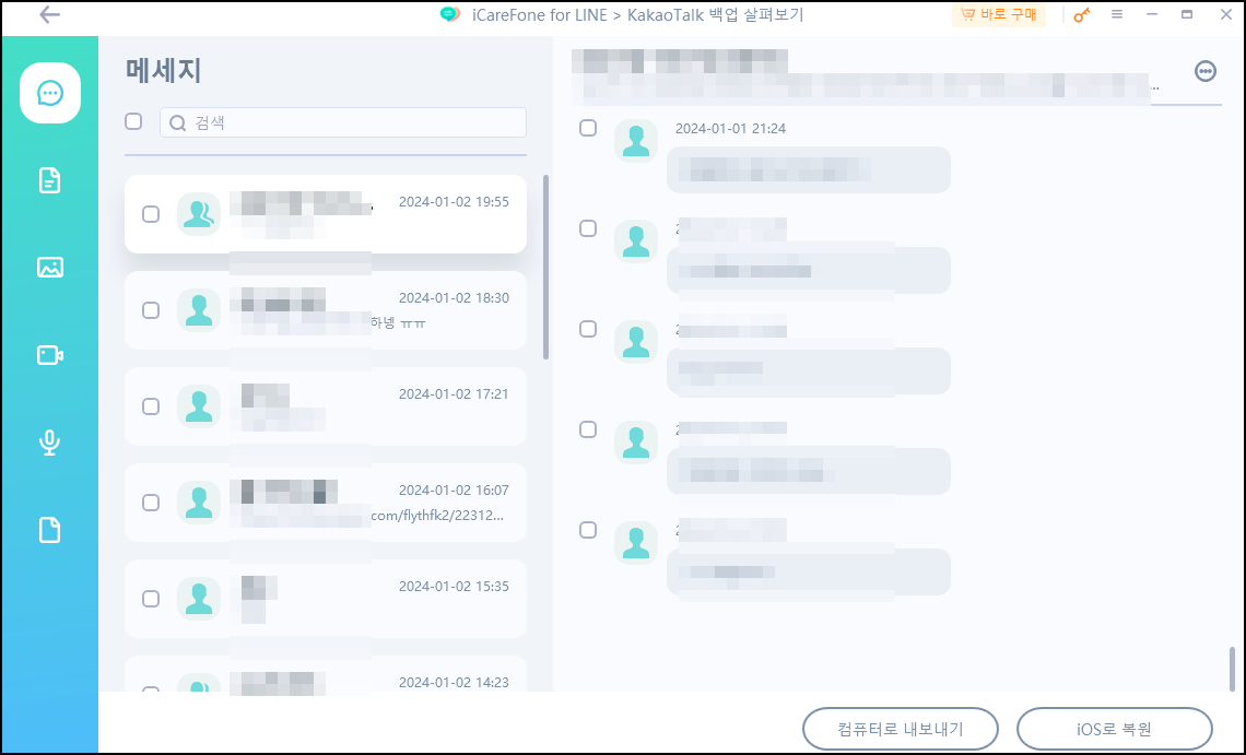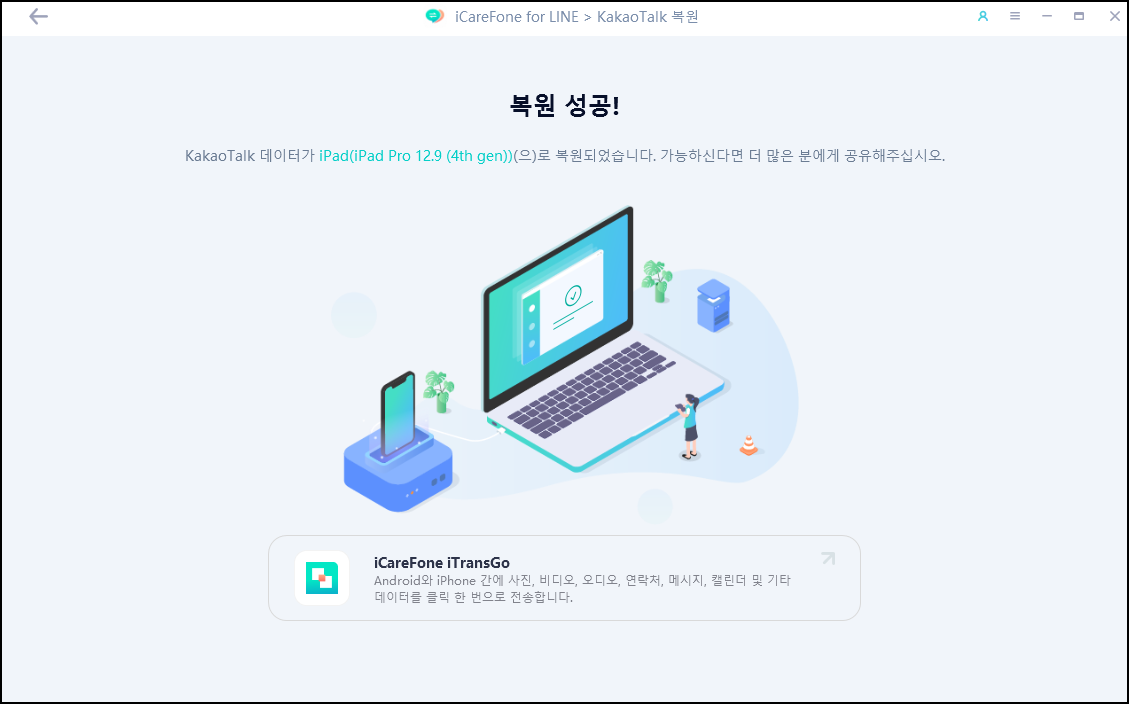 "iCareFone for Kakao Talk 아이케어폰 카카오톡" 프로그램을 통해 백업받은 파일로 100% 완벽 복구가 되었어요. 오늘은 이렇게 아이폰&아이패드 유저분들이 좋아할 만한 카카오톡 백업&복구프로그램에 대해 소개해드렸는데, 중요자료가 많아 평소 백업을 해두고 싶으신 분들은 유용하게 사용할 수 있을 것 같아요. 그럼 지금까지 휴잉이었습니다. 감사합니다.