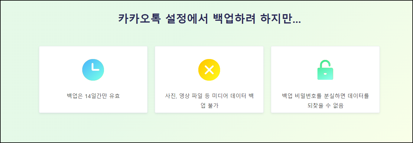 카톡 톡서랍은 실시간으로 연동된다는 강점으로 최신백업상태를 유지할수 있지만 반대로 기존의 데이터가 지워지고 새로운 데이터로 덮어진다는 단점이 있어요. 즉, 예전에 데이터를 백업하는 게 어렵다고 해요. 또한 최대 100G 용량까지만 지원이 되고 백업의 경우 앞서 말씀드린 대로 14일까지만 유효하며, 사진, 영상은 유료로만 저장이 돼요. 만약 패스워드를 잊어버리게 되었을 경우 되살리기 어렵다는 단점 또한 있어 이런 부분으로 인하여 톡사랍을 이용하는 분들은 많지 않아요.