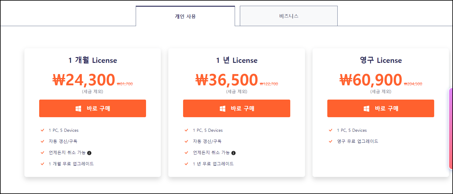 "iCareFone for Kakao Talk 아이케어폰 카카오톡" 서비스는 1개월 24,300원, 1년 36,500원, 영구 60,900원으로 이용이 가능해요. 톡서랍을 2년간 구독한다면 6만 원이나 되는데, 영구라이선스를 구입하면 평생 동안 카톡이 망하기 전까지 백업&복구를 사용할 수가 있어요. 특히 현재 특별 세일기간으로 15,000원 할인을 진행 중인데, 1년 9,300원, 1년 21,500원, 영구 45,900원으로 구입하실 수가 있어요.