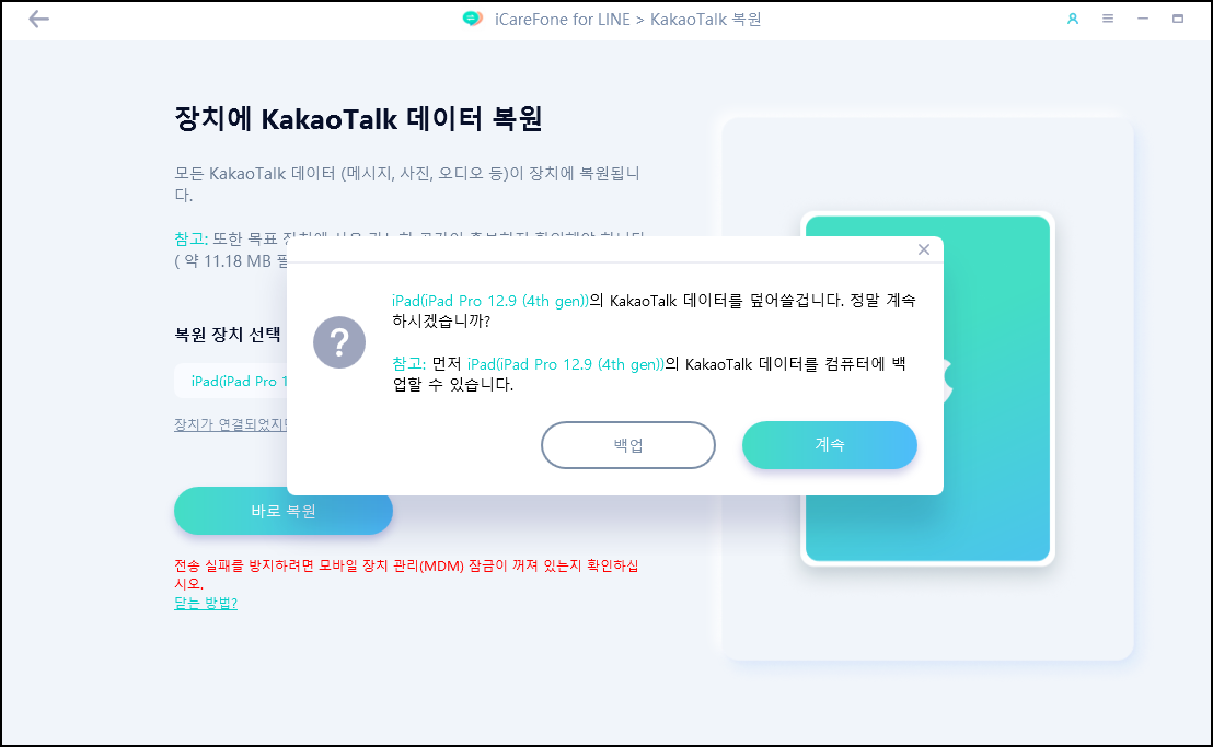 유료 라이선스를 제공받아 카카오톡 복구를 진행해 보도록 할게요. "계속"버튼을 클릭해 주세요.