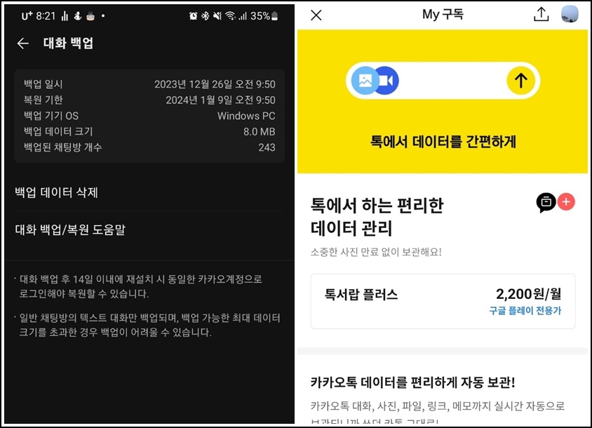기기 변경을 하거나 평소 중요한 데이터(대화내용)의 경우 백업을 해두시는 게 좋은데, 카카오톡에서 톡서랍이라는 기능으로 사진과 동영상 등 중요자료를 저장할 수 있는 시스템을 월 구독료 2,200원을 지불해야 이용할 수가 있어요.