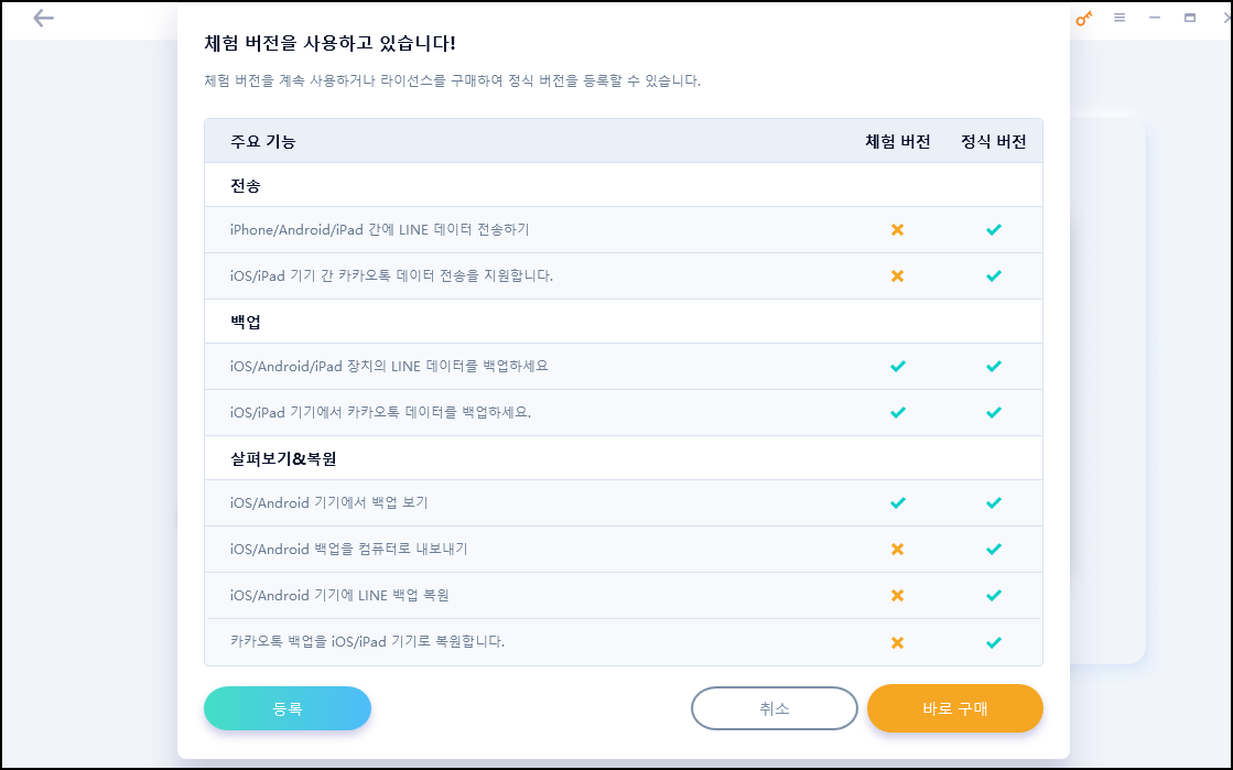 체험버전의 경우 전송기능은 제공되지 않고, 백업이나 백업된 파일 보기의 경우는 가능해요. 하지만 마이그레이션처럼 전송이나 백업된 파일을 iOS / iPad로 복원, 백업파일을 컴퓨터로 보내기 위해선 유료 라이선스를 구입하셔야 되는 점 참고해 주세요.