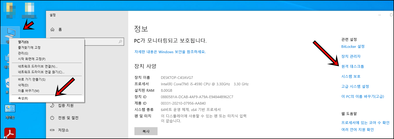첫 번째 내 컴퓨터에 마우스 오른쪽 클릭 후 [속성] -> [원격 데스크톱]을 클릭해 주세요.