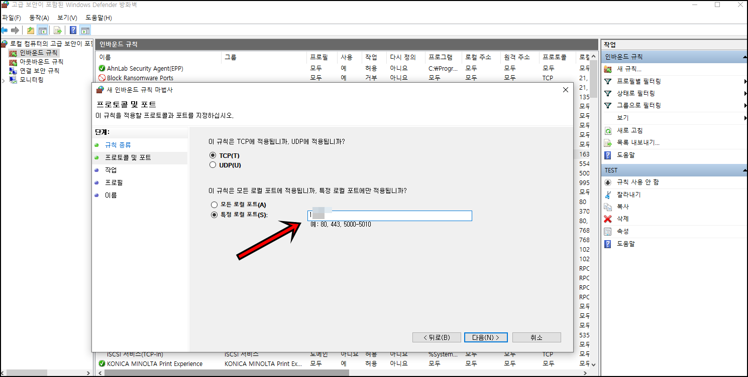 여러분이 지정한 mstsc 포트번호를 "특정 로컬포트"에 입력 후 다음으로 넘어가주세요.