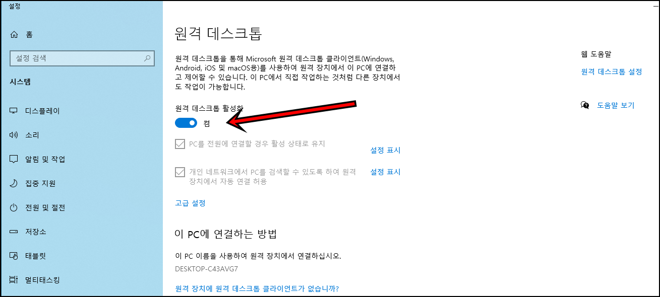 원격 데스크톱 활성화 부분이 꺼져있을 텐데 켜주세요.