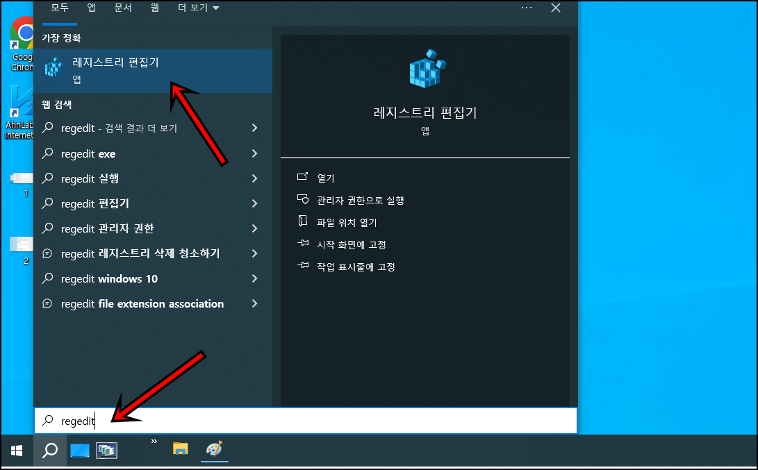 검색창에 regedit 입력 후 "레지스트리 편집기"를 실행해 주세요.