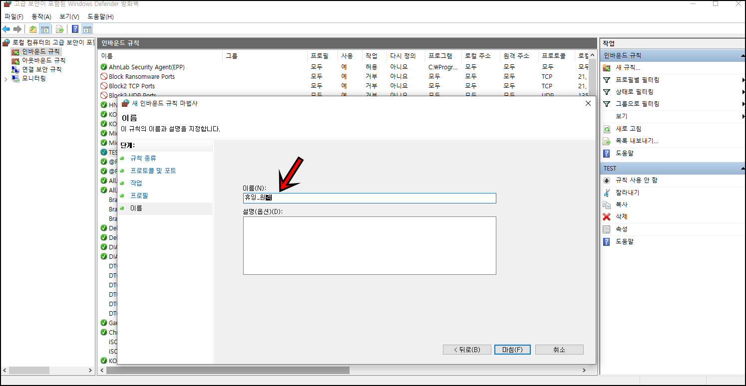 규칙의 이름을 지정후 "마침"을 클릭해 주세요.