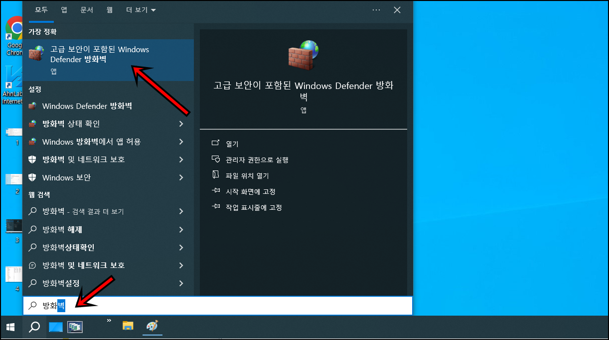 검색창에 "방화벽"을 검색하셔서 "고급 보안이 포함된 Windows Defender 방화벽"을 실행해 주세요.