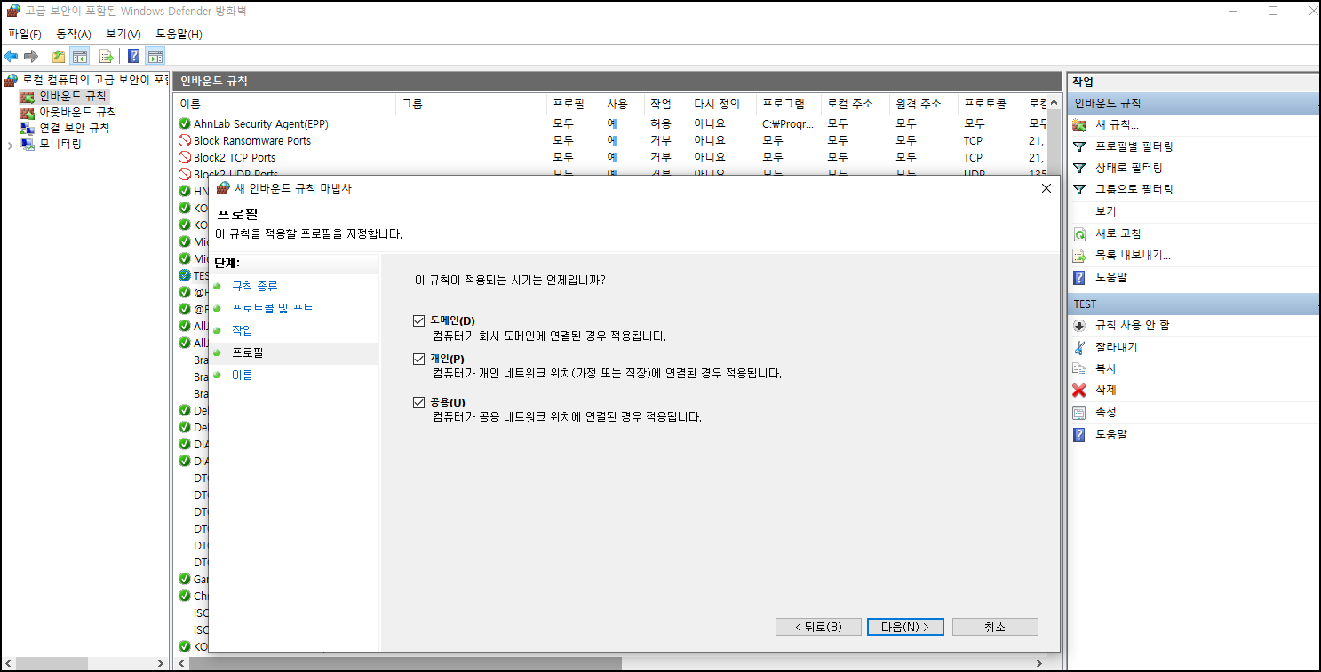 이제 윈도 방화벽을 통해 특정 IP만 접속하도록 설정해볼게요. 윈도우 방화벽은 당연히 켜져 있어야겠죠?^^