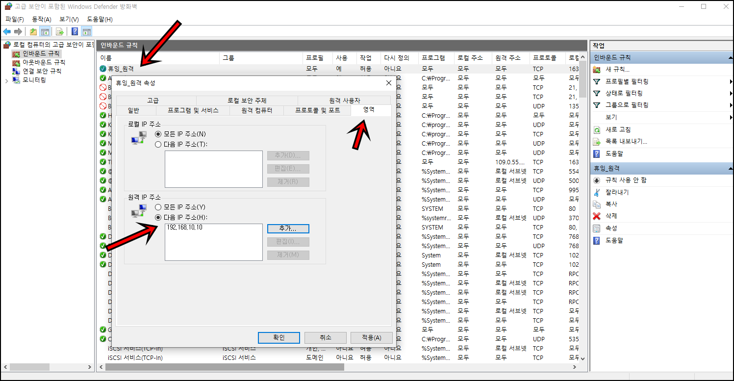 해당 규칙이 추가가 되었으면, 해당 규칙을 더블 클릭 후 속성창이 활성화 되면 "영역"부분을 클릭후 원격 IP주소 부분에 mstsc 접속을 허용할 IP를 입력 후 적용->확인 버튼을 클릭하시면 완료가 돼요!!!
