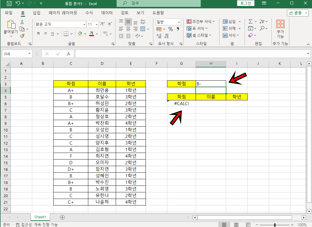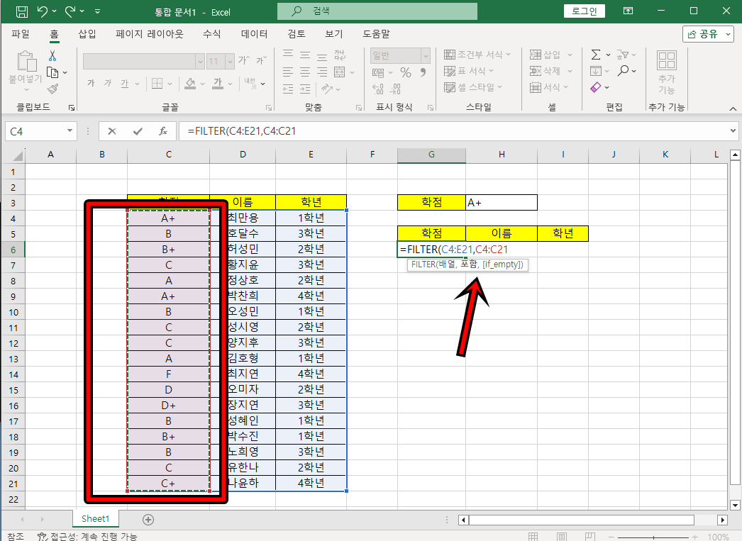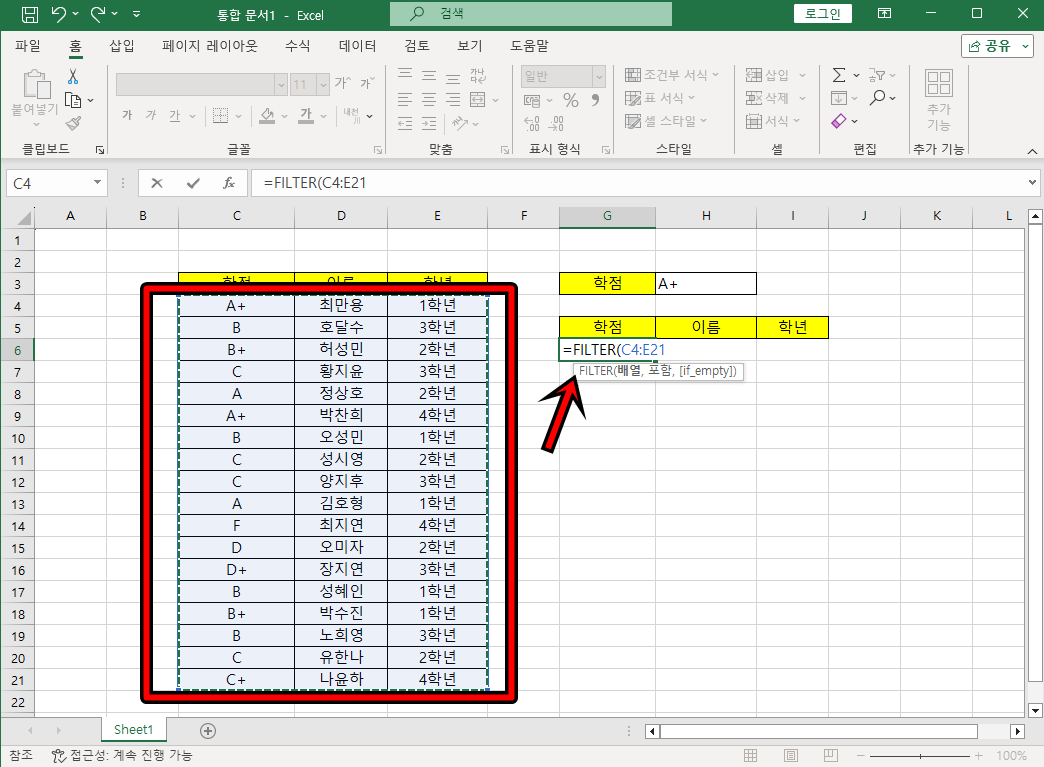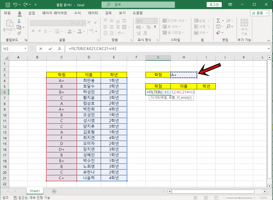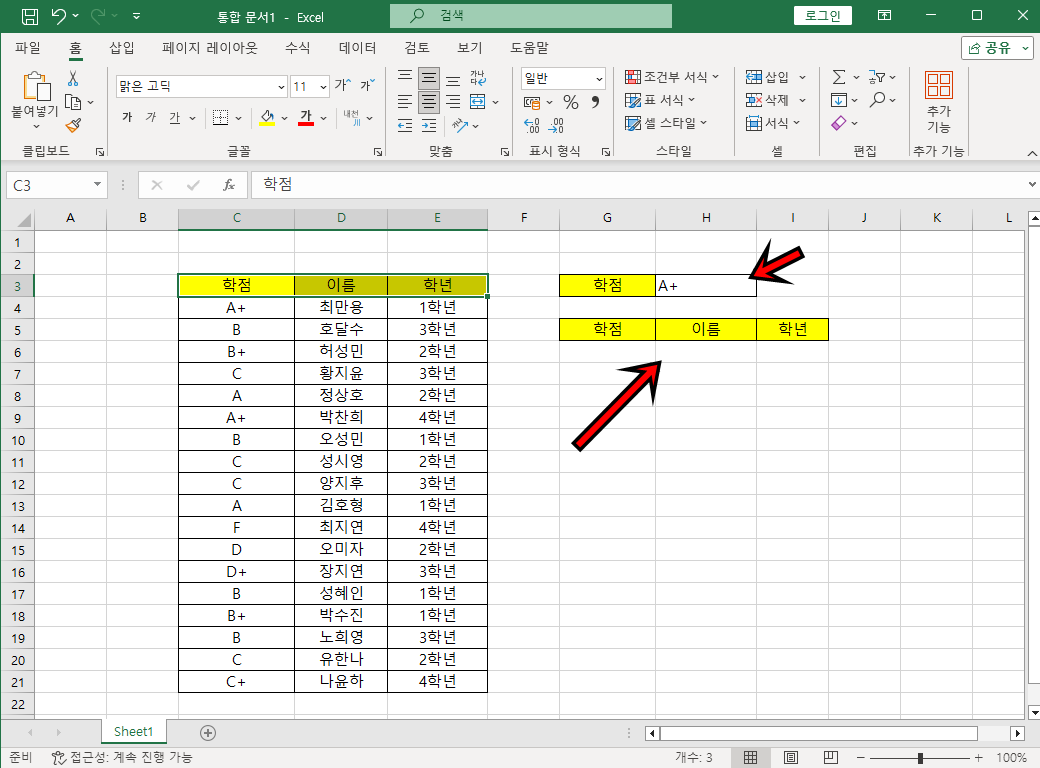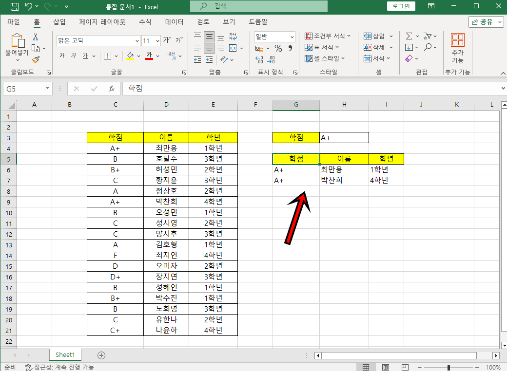 이제 학점 셀에 학점을 입력하면 데이터를 필터링하여 조건에 맞는 데이터를 추출하게 돼요.