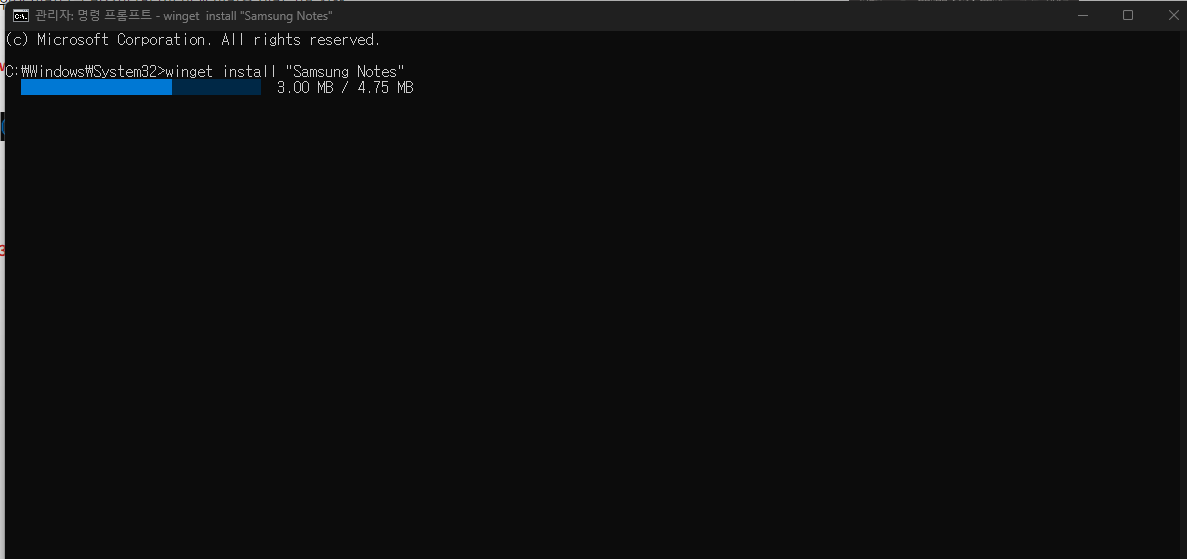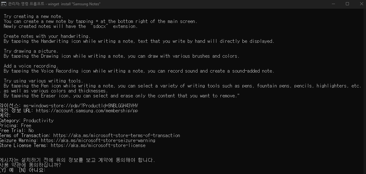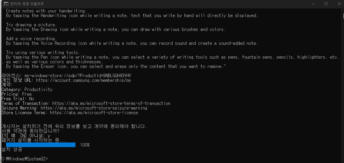 1번 명령어를 입력하면 위 사진처럼 삼성노트 앱 설치가 진행될 거예요.
