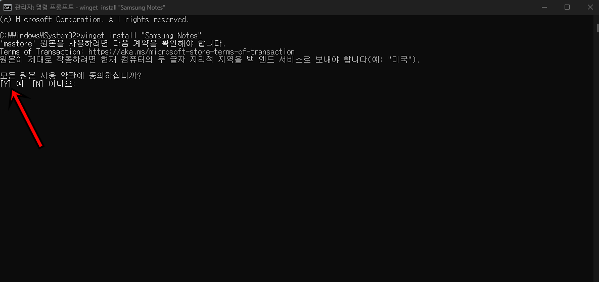 사용 약관에 동의합니까 메시지는 Y를 눌러서 진행해 주세요.
