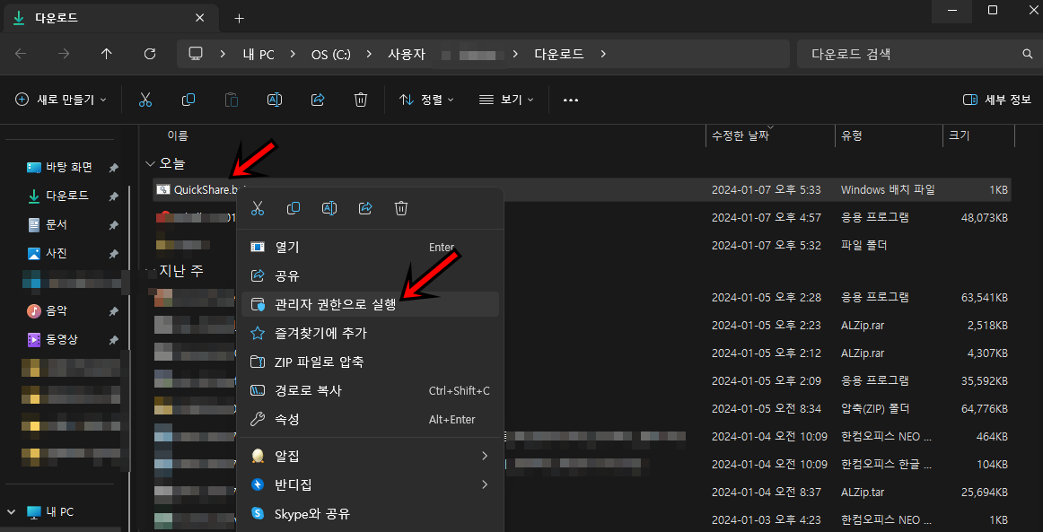 다운로드한 파일을 마우스 우클릭 후 "관리자 권한으로 실행"을 클릭해 주세요.