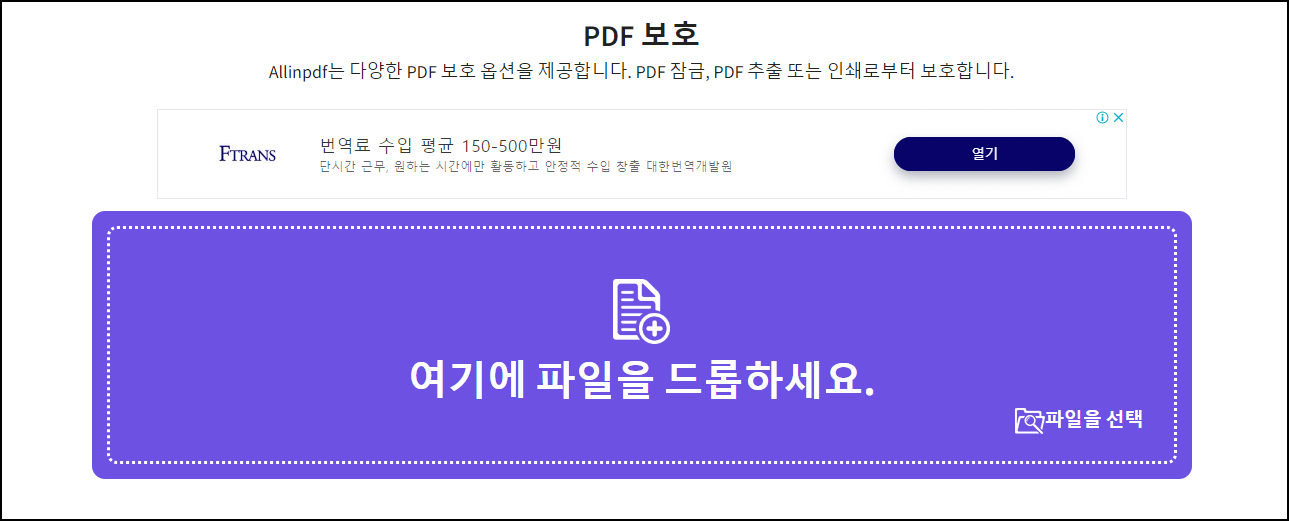 "여기에 파일을 드롭하세요" 부분에 파일을 드래그하던가, 클릭하여 패스워드를 걸어주고 싶은 PDF파일을 열어주세요.