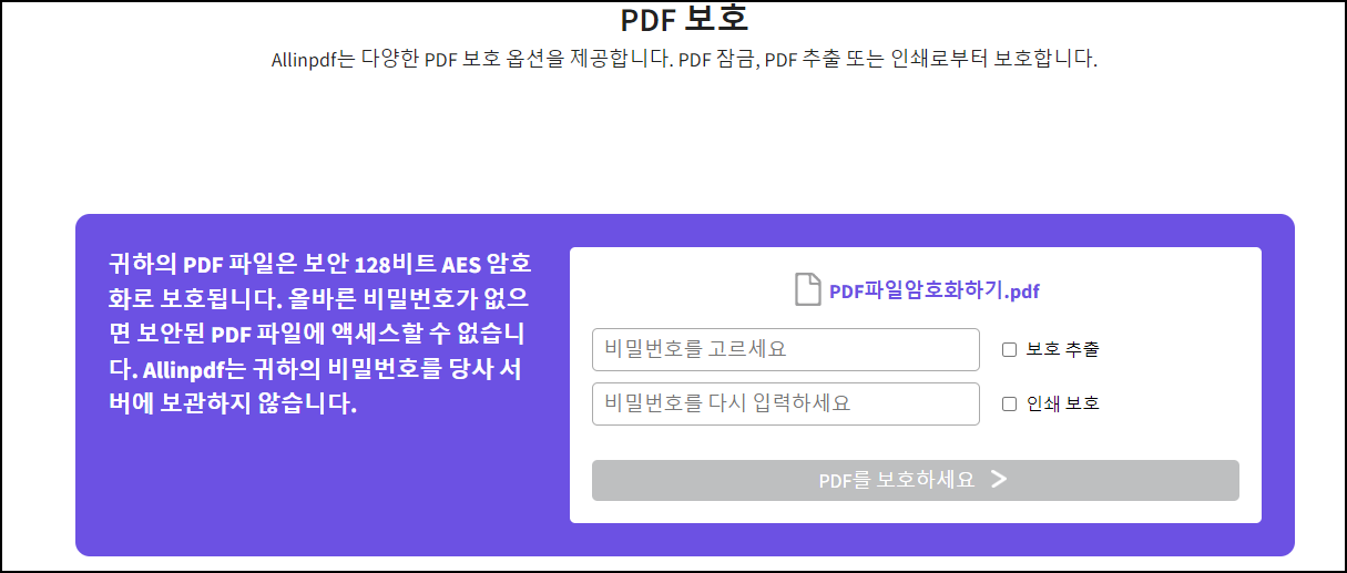 PDF파일에 사용할 암호를 입력 후 "PDF를 보호하세요"를 클릭하시면 PDF에 암호가 설정이 되고 다운로드할 수가 있어요.