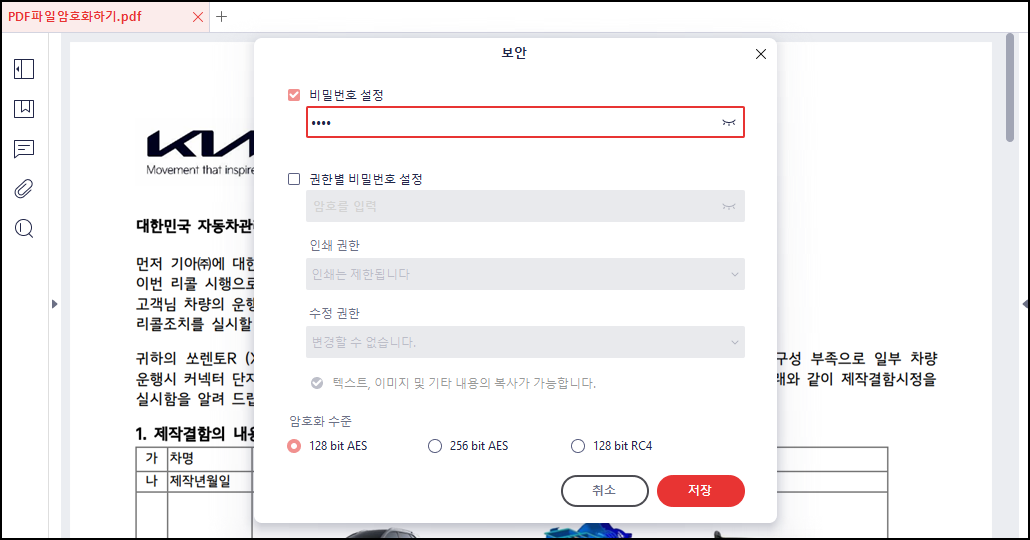알 PDF의 경우 "비밀번호는 영문 대/소문자, 숫자, 특수문자 중 2개 이상의 조합하여 8 자 이상"을 입력해야 한다고 하네요. 패스워드를 다시 입력 후 저장을 합니다.