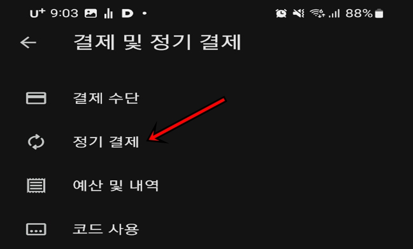 항목 중에서 위 사진처럼 "결제 및 정기 결제"메뉴를 클릭해 주세요.