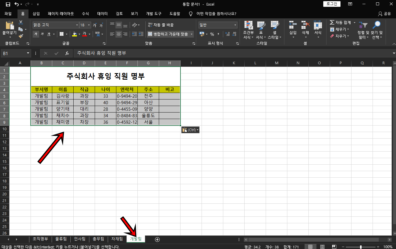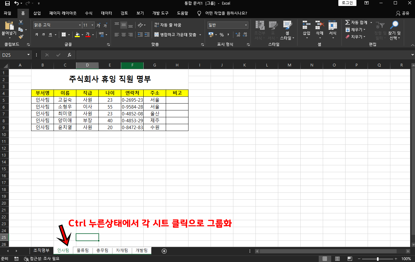위와 같이 조직명부가 있다고 가정해 볼게요. 각각 팀별로 시트를 만들어서 엑셀 표를 분류해 보도록 해요.