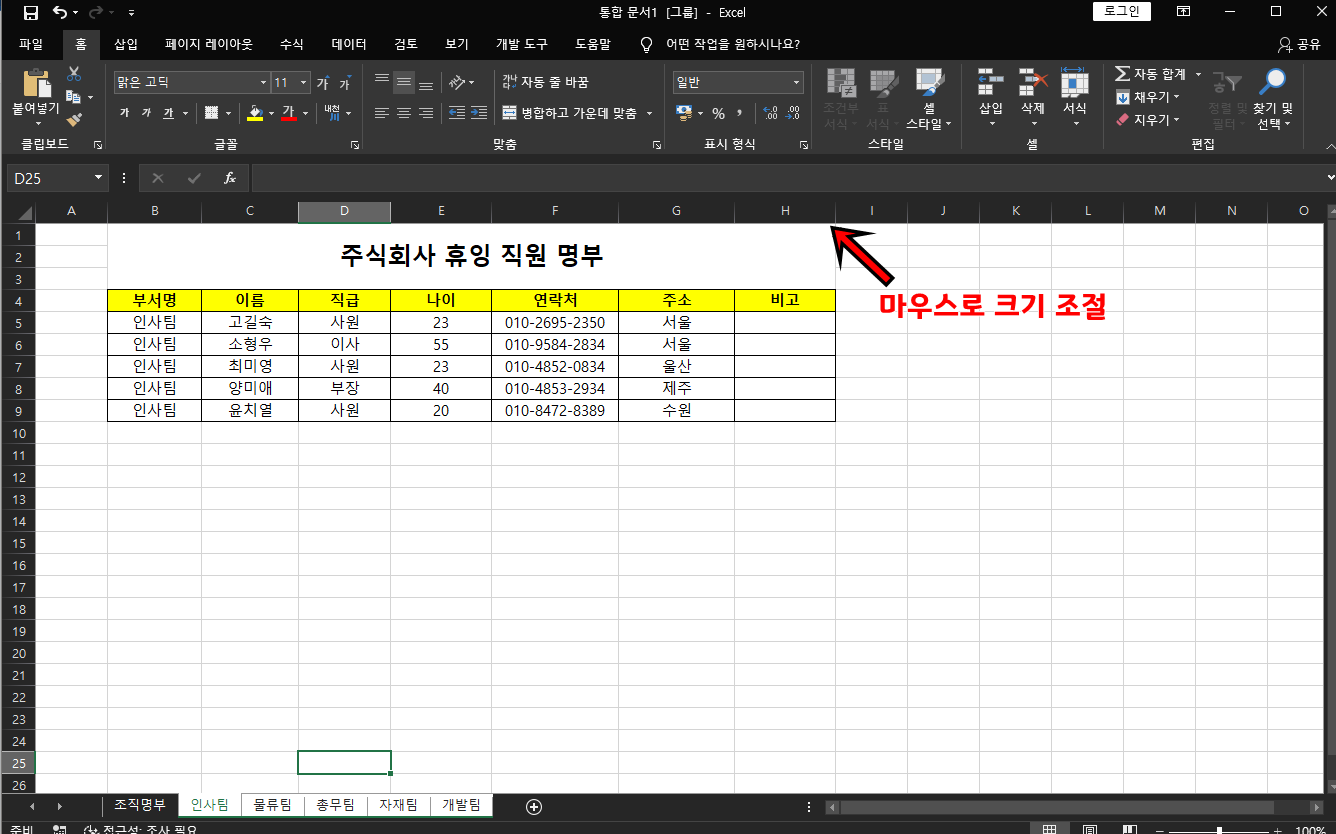 인사팀 시트의 크기를 수정했는데, 개발팀 시트도 같이 크기가 조절된 걸 확인할 수 있어요.