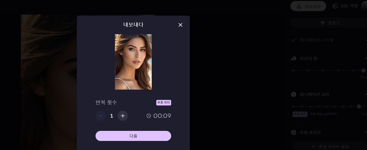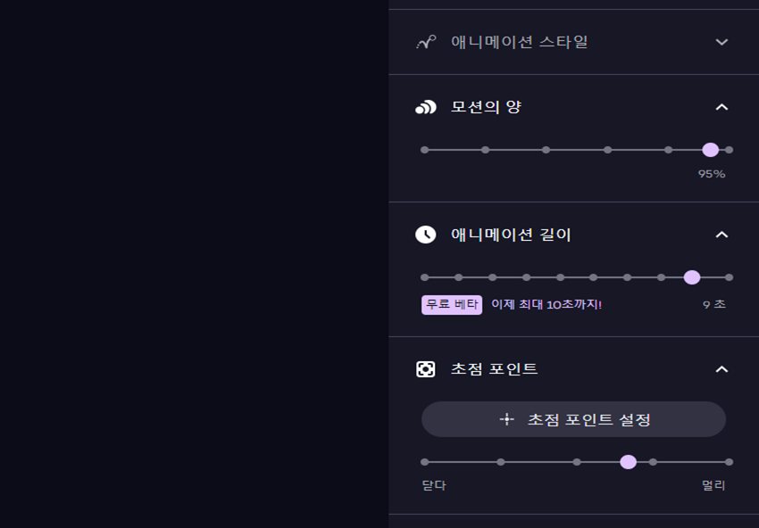 모션의 양이나 애니메이션길이등도 설정이 가능해요. 무료버전의 경우 최대 10초까지만 가능하다고 해요.