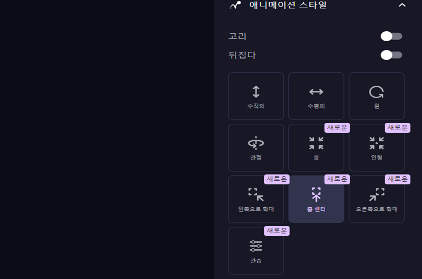 애니메이션 스타일을 통해 이미지를 상하, 좌우 등 확대, 축소등 다양한 관점으로 움직이게 할 수 있어요.