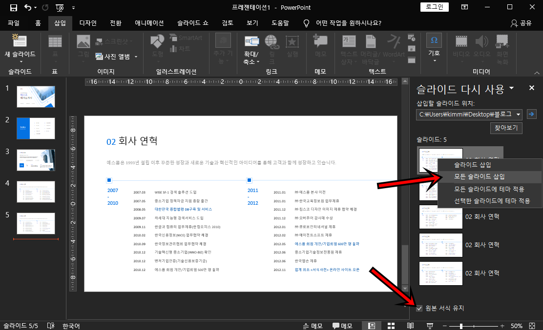 동일하게 [원본 서식 유지]를 체크하고 슬라이드에 마우스 오른쪽 클릭 후 [모든 슬라이드 삽입]을 클릭해 주시면 삽입이 완료가 돼요.