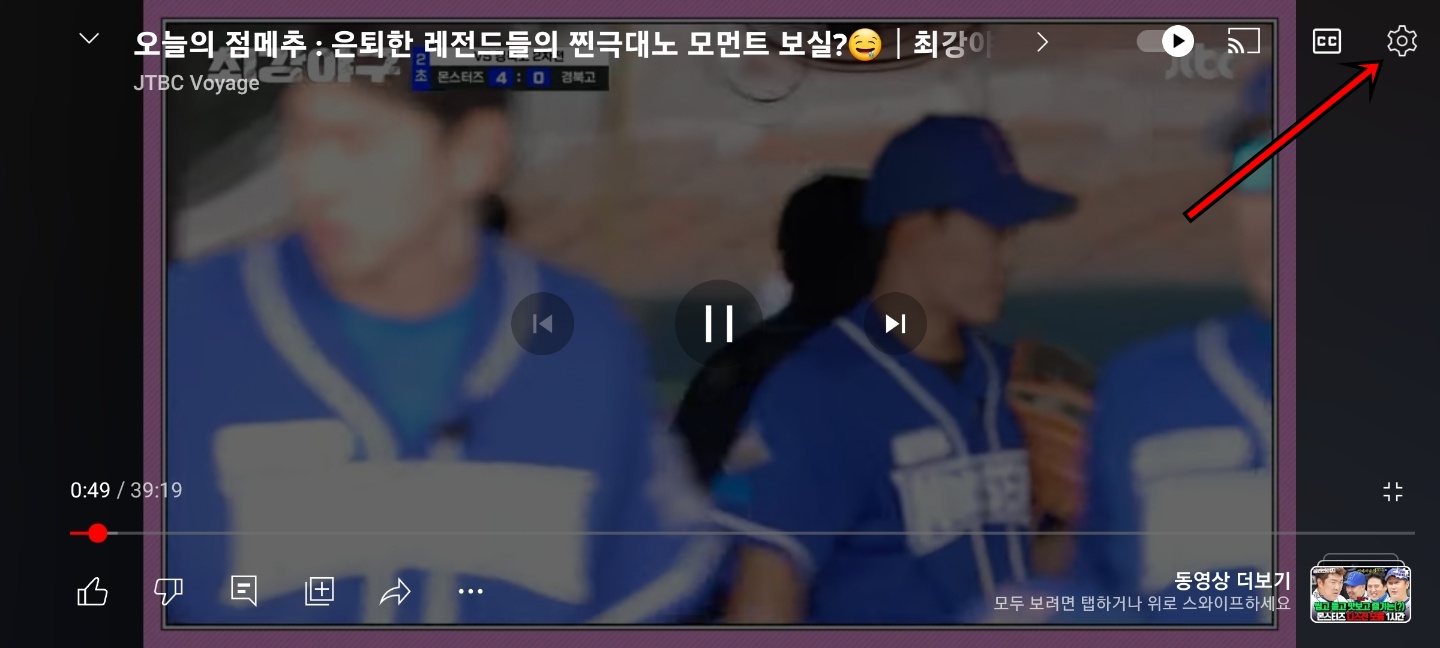 방법은 매우 간단해요. 영상을 시청시 오른쪽 상단의 톱니바퀴[설정] 메뉴를 클릭해 주세요.