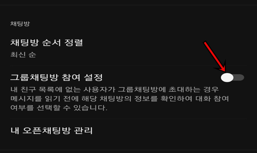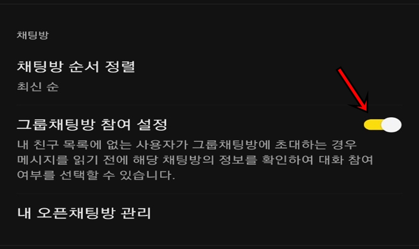 현재 대부분 "그룹 채팅방 참여 설정"부분이 비활성화되어 있을 텐데, 해당 버튼을 클릭하면 활성화가 돼요.