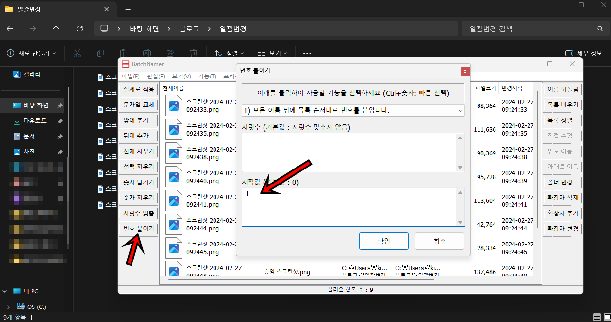 왼쪽메뉴에서 "번호 붙이기"메뉴를 클릭 후 시작값을 입력해 주세요. 시작값이 1인 경우[휴잉 스크린숏 1~휴잉 스크린숏 8]처럼 파일명에 숫자가 붙게 돼요. "확인"버튼을 클릭해 주세요.