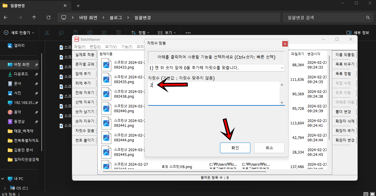 자릿수를 2로 하면 01,02,03~99 해당 패턴으로 자릿수가 맞춰서 표시되게 돼요. "확인"버튼을 클릭해 주세요.