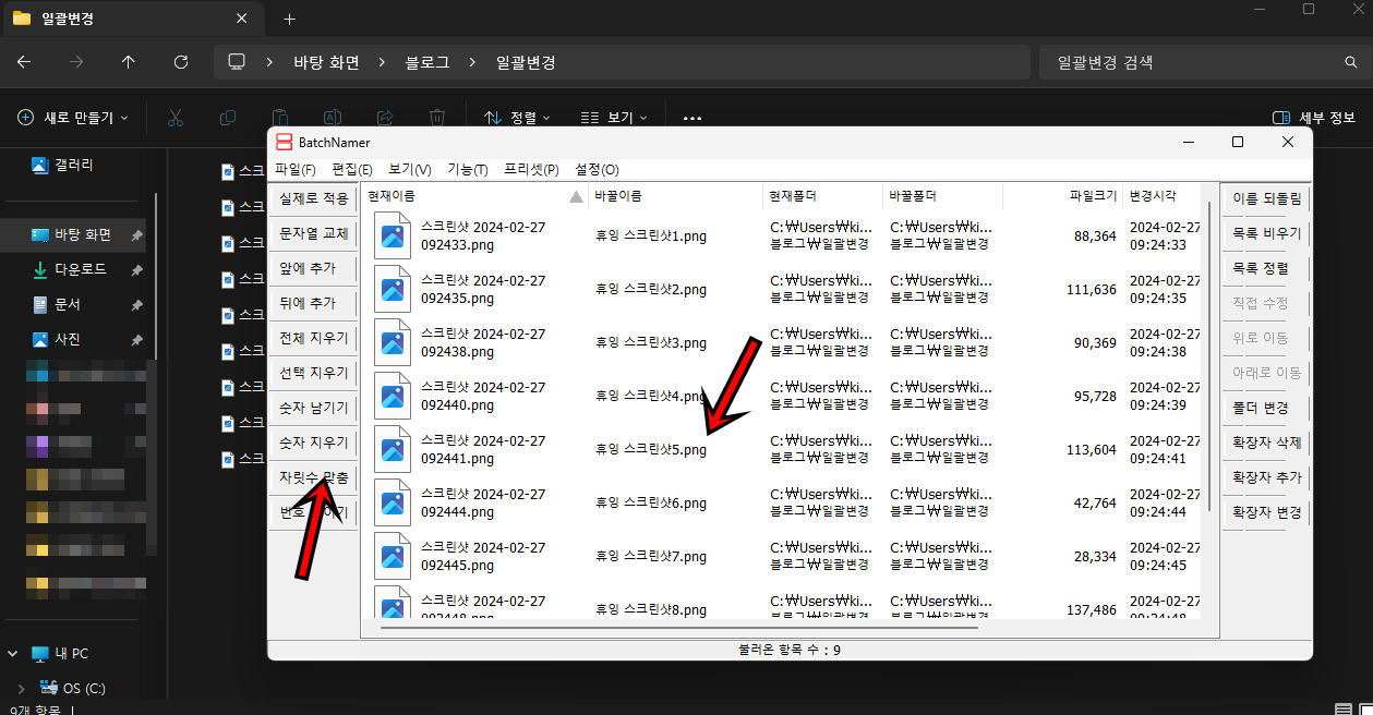 바뀔 이름 부분에 변경된 파일명으로 바뀐 걸 확인할 수 있어요. 만약 파일명뒤에 숫자들을 자릿수로 표현하고 싶다면 왼쪽 메뉴에서 "자릿수 맞춤"을 클릭해 주세요.