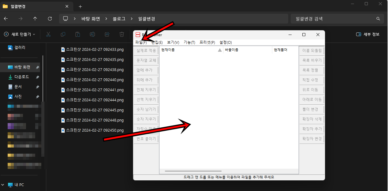 프로그램이 실행되면 파일을 전체 드래그 해서 옮기셔도 되고, 상단의 [파일] 버튼을 클릭하여 일괄변경하고 싶은 파일들을 불러오셔도 돼요.