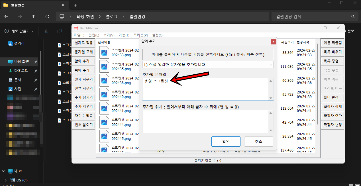추가할 문자열에 적용하고 싶은 파일명을 입력 후 "확인"버튼을 클릭해 주세요.