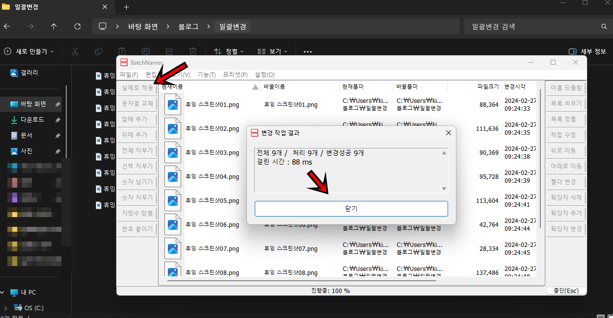 이제 수정한 내용을 실제 파일에 적용하여 일괄변경하고 싶다면 왼쪽 상단의 "실제로 적용"버튼을 클릭해서 파일명을 일괄 변경해 주세요.