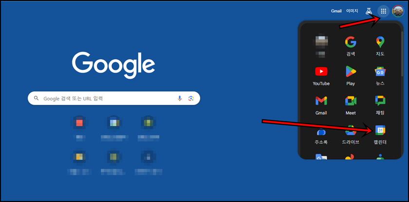 크롬을 실행 후 로그인 하셨다면 오른쪽 상단의 점 모양의 아이콘을 클릭 후 "캘린더"아이콘을 클릭합니다.