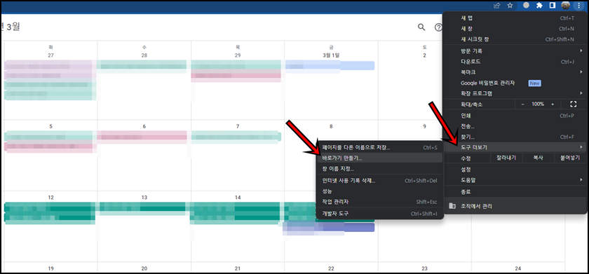 캘린더 창으로 이동이 되면 오른쪽 상단의 점 3개 버튼을 클릭 후 "도구 더 보기" -> "바로가기 만들기"를 클릭합니다.