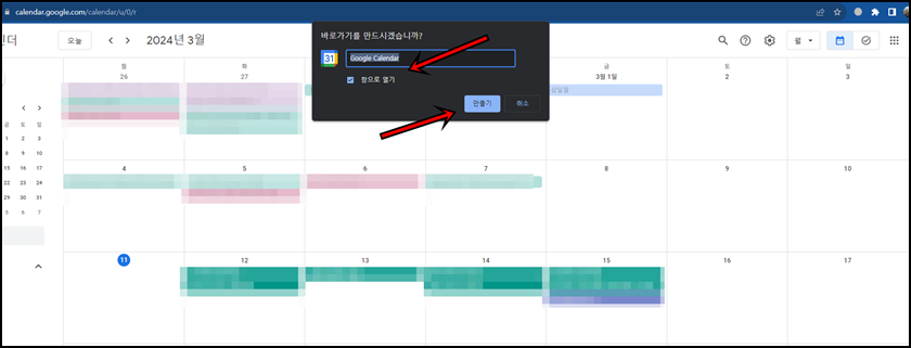 바로가기를 만드시겠습니까?라는 메시지가 나오면 캘린더의 이름을 입력 후 "창으로 열기"를 체크 후 "만들기"를 클릭합니다.