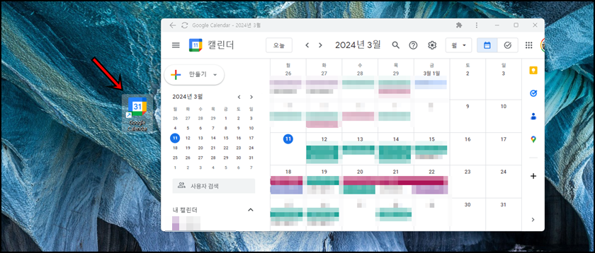 컴퓨터 바탕화면에 구글 캘린더 바로가기 아이콘이 생성이 되며 더블 클릭하면 구글 캘린더로 바로 이동하게 됩니다.
