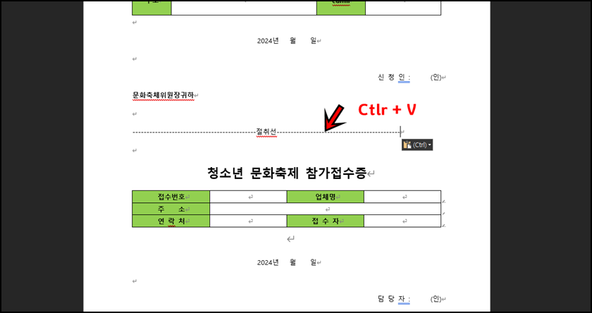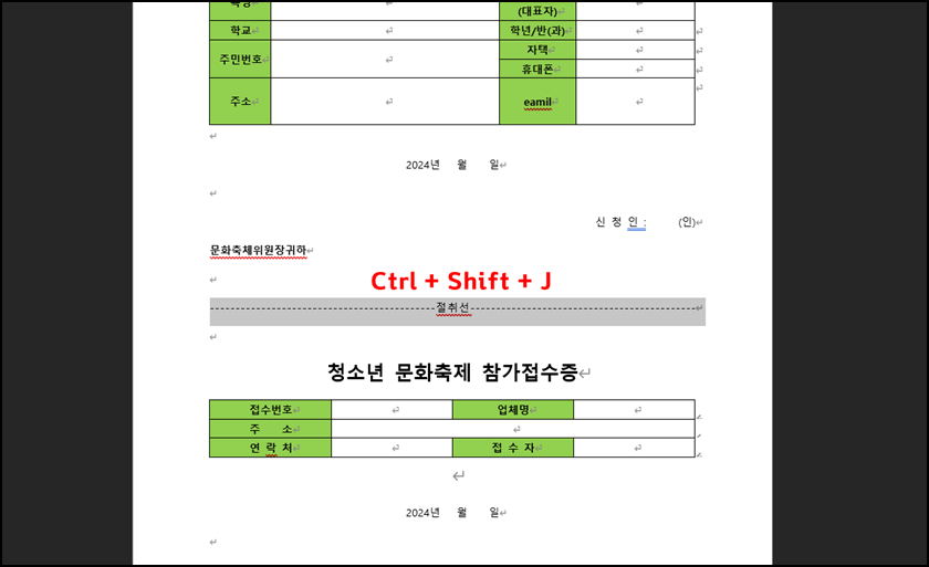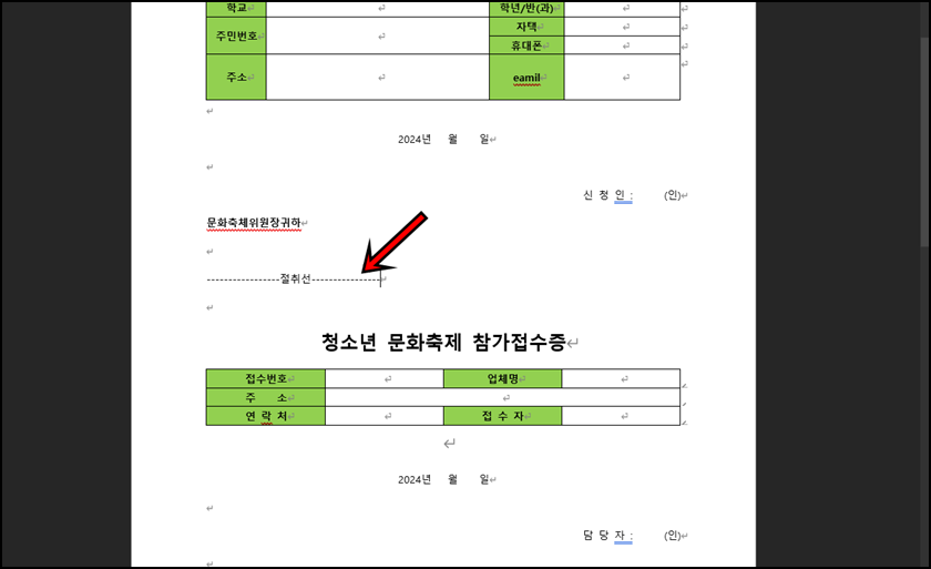 예를 들어 위와 같이 접수증을 만드는데 절취선을 만들어야 한다고 가정해 보겠습니다. 제가 소개해드리는 방법을 모른다면 대다수분들은 점선을 하나씩 입력하고 글자를 가운데에 맞추려고 노력하실 겁니다. 하지만 이제 그럴 필요 없이 간단하고 깔끔하게 맞추는 방법을 안내해 드리겠습니다.