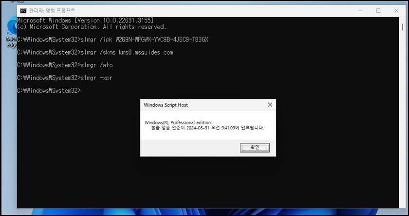 slmgr -xpr를 입력 후 Enter를 치면 위 사진처럼 볼륨 정품인증이 2024-08-31일에 만료된다는 메시지가 나옵니다.