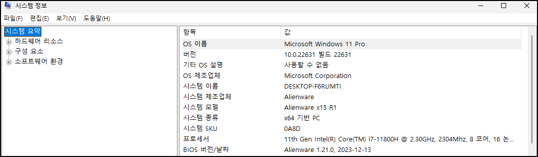 윈도 검색창에 "시스템 정보"를 입력 후 들어가시면 OS정보를 확인할 수 있습니다. 저의 경우는 windows 11 Pro로 확인이 됩니다.