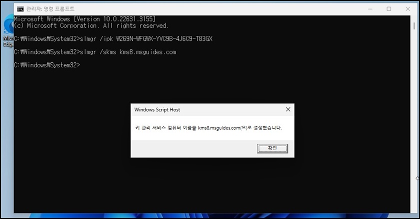 다음은 slmgr /skms kms8.msguides.com을 입력 후 Enter를 치면 위 사진처럼 "키 관리 서비스 컴퓨터 이름을 kms8.msguides.com으로 설정했습니다"라는 창이 나옵니다. 확인버튼을 클릭해 줍니다.