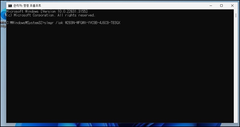 slmgr /ipk W269N-WFGWX-YYC9 B-4 J6 C9-T83GX (위에서 확인한 os 제품키 입력) 입력 후 Enter를 쳐줍니다.